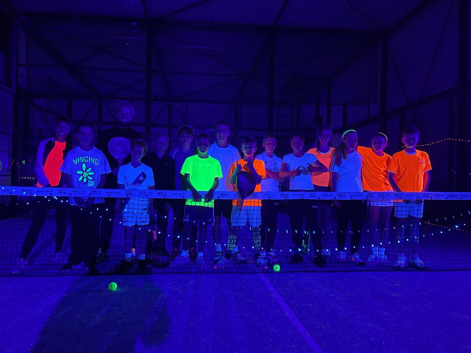 Nadat de padelbanen bij YOR’s uitgebreid versierd zijn met fluor ballonnen, fluor vlaggetjes, lichtstaafjes, lichtsnoeren en natuurlijk de blacklight lampen geplaatst waren mochten de jongste kids aftrappen. Allemaal mooi uitgedost in wit of fluor of zelfs een rokje met lichtjes kwamen zij naar YOR’s. Zij zijn bijna allemaal pas net gestart, maar de fel geel oplichtende bal ging fanatiek op en neer. En een schik dat ze hadden. Tussentijds was er een glaasje ranja en een snoepje. Werd er neon geschminkt en ook werd er een spelletje gespeeld.